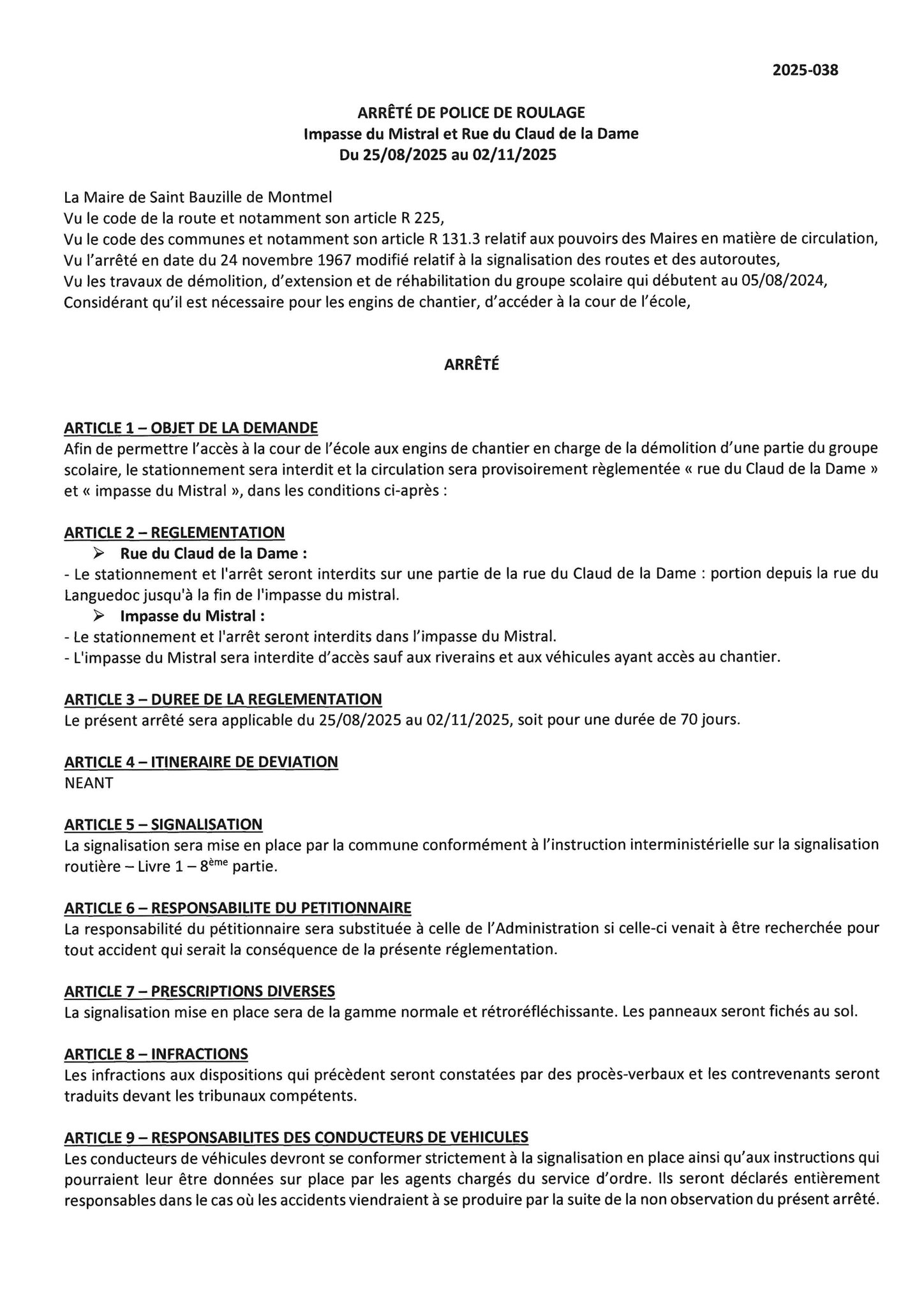 Afin de permettre l’accès à la cour de l’école aux engins de chantier en charge des travaux du groupe scolaire, le stationnement sera interdit et la circulation sera provisoirement règlementée « rue du Claud de la Dame » et « impasse du Mistral », dans les conditions ci-après :